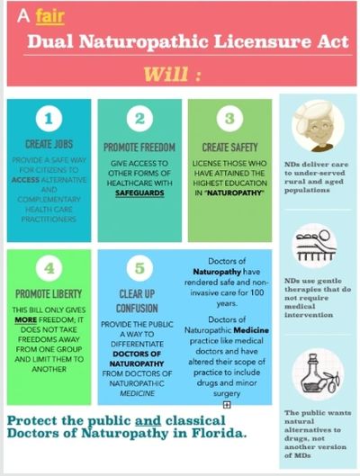 HB 223 will prevent traditional naturopathic doctors from using their titles. While it does differentiate Naturopathy fdrom Naturopathic Medicine, traditional naturopathic doctors will not be able to use any modalities and will be relegated to "health coach" status. Titles "Doctor of Naturopathy" and "ND" will be exclusive to pseudomedical naturopaths. The ANA has been vocal in opposing this with the sponsor of this bill, Rep. David Smith. FLORIDA NATUROPATHS, GET ORGANIZED AND MAKE NOISE! Your national organization is with you. A helpful infographic is available for you to use--click the button and download!